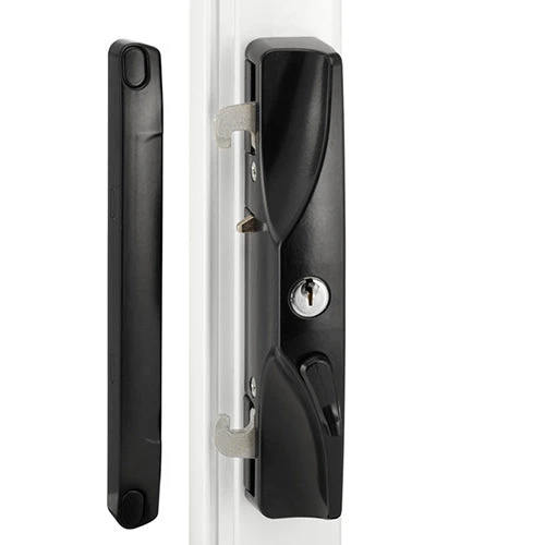 An all-metal lock for sliding glass doors. Slim design for doors with a large stiffening wing or narrow frame.